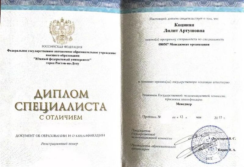 - Южный федеральный университет, экономический факультет, специализация - менеджмент организации, квалификация - менеджер (диплом с отличием), 2009–2015 гг.