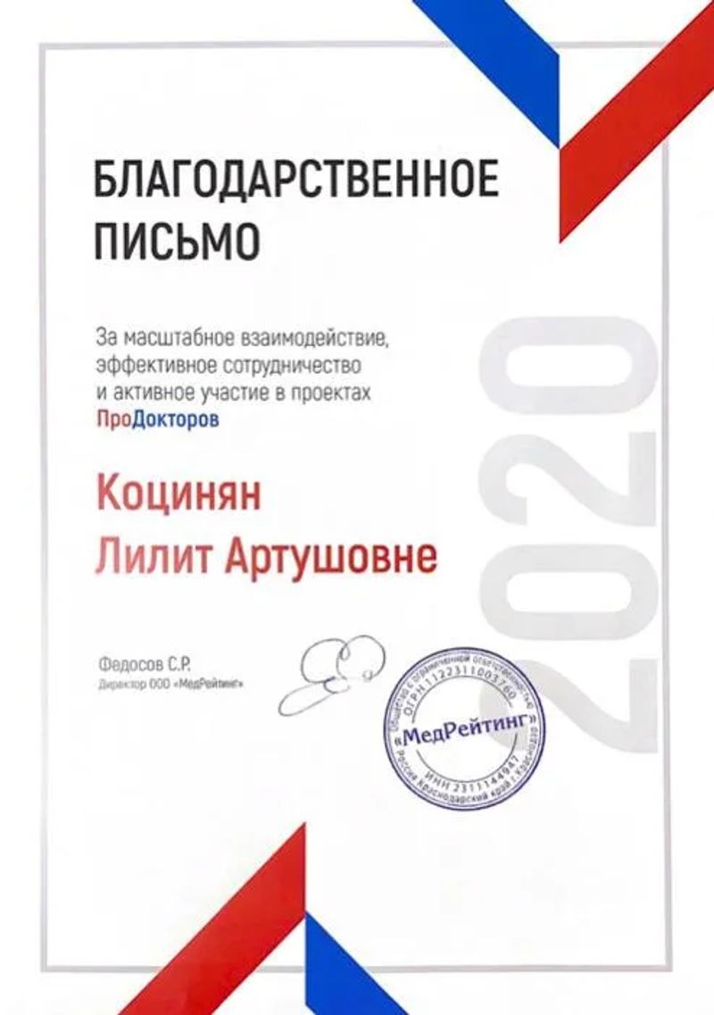 - Благодарственное письмо за активное участие в проектах «ПроДокторов», 2020 г.