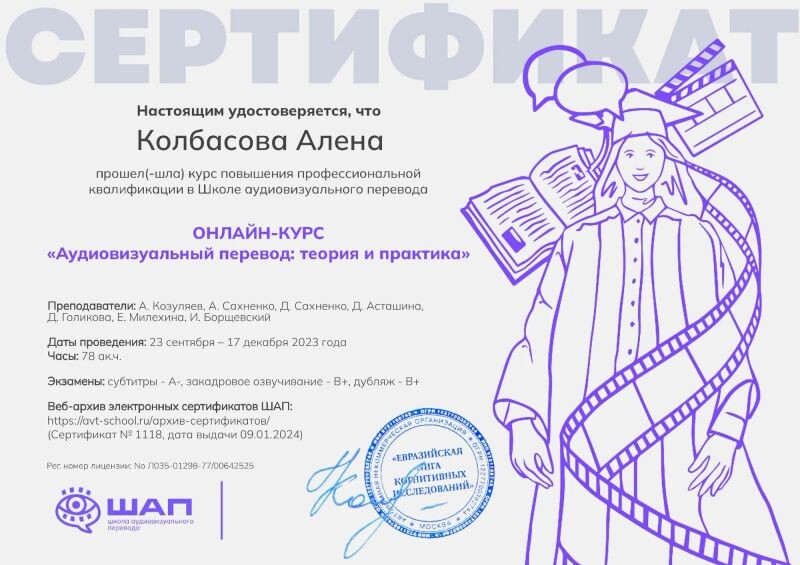 - ШАП, курс «Аудиовизуальный перевод: теория и практика», 2023 г.