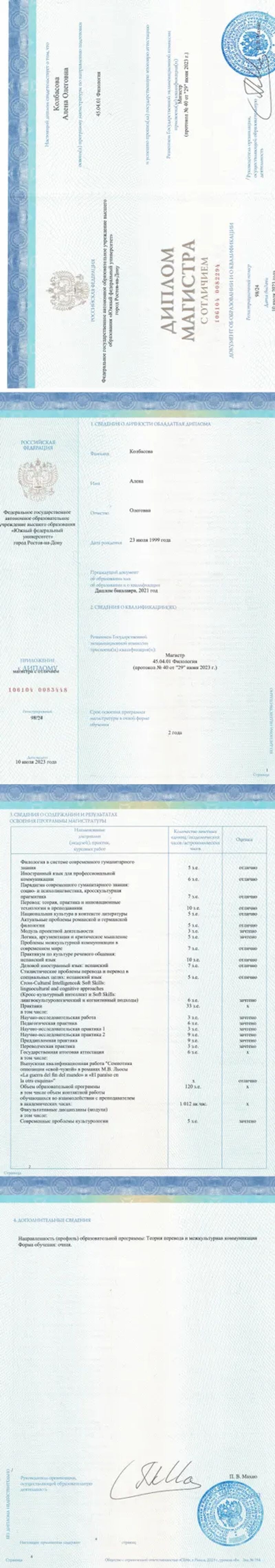 - Южный федеральный университет, филология, магистр, 2023 г.