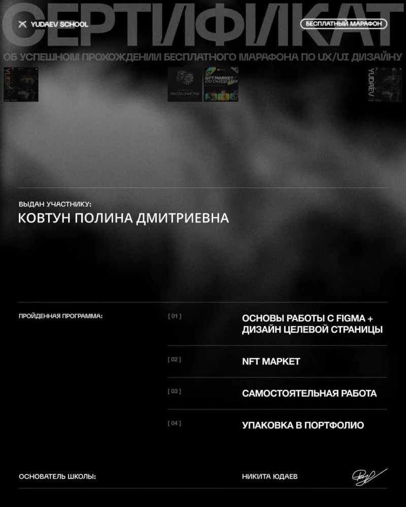 - Сертификат о прохождении бесплатного интенсива в онлайн школе YudaevSchool (с 2025 г.).