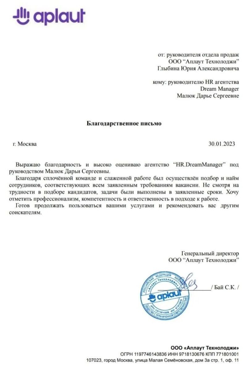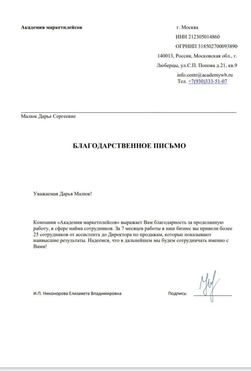 - Академия маркетплейсов, благодарственное письмо за проделанную работу в сфере найма сотрудников, 2023 г.