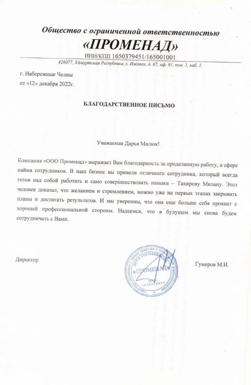 - ООО «Променад», благодарственное письмо за проделанную работу в сфере найма сотрудников, 2022 г.