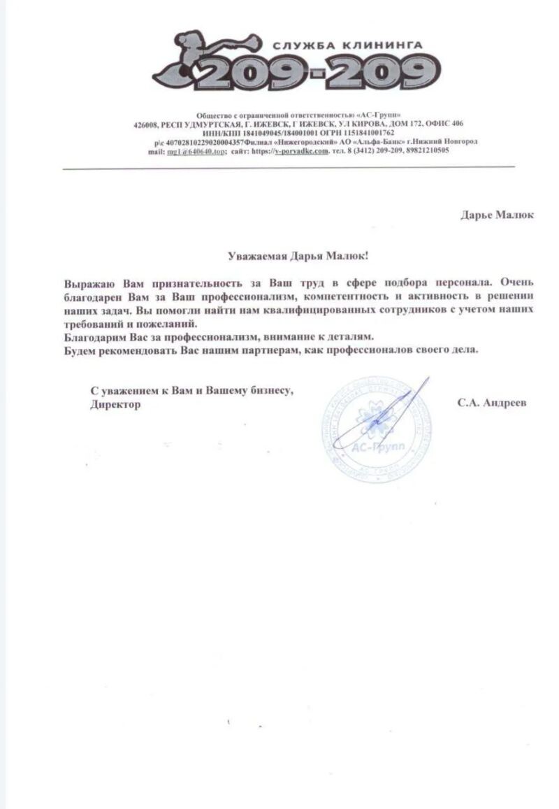 - ООО «АС-групп», благодарственное письмо за труд в сфере найма персонала, 2022 г.
