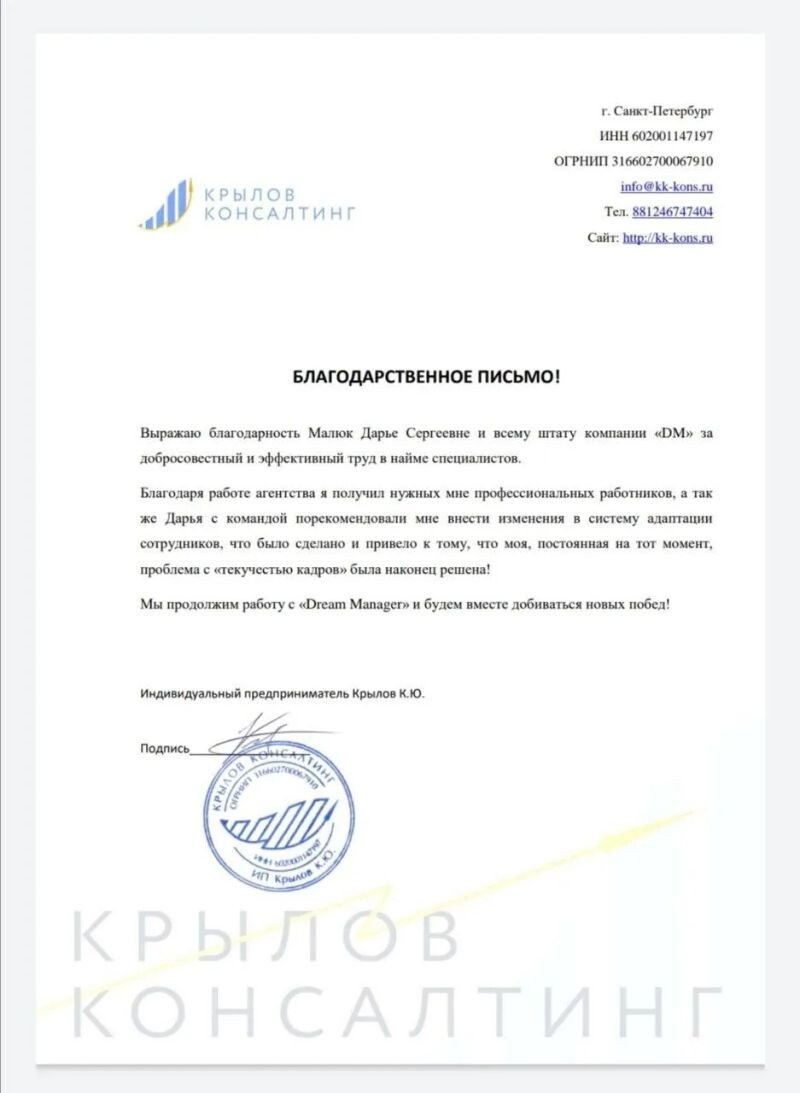 - Крылов консалтинг, благодарственное письмо за добросовестный и эффективный труд в найме специалистов, 2023 г.