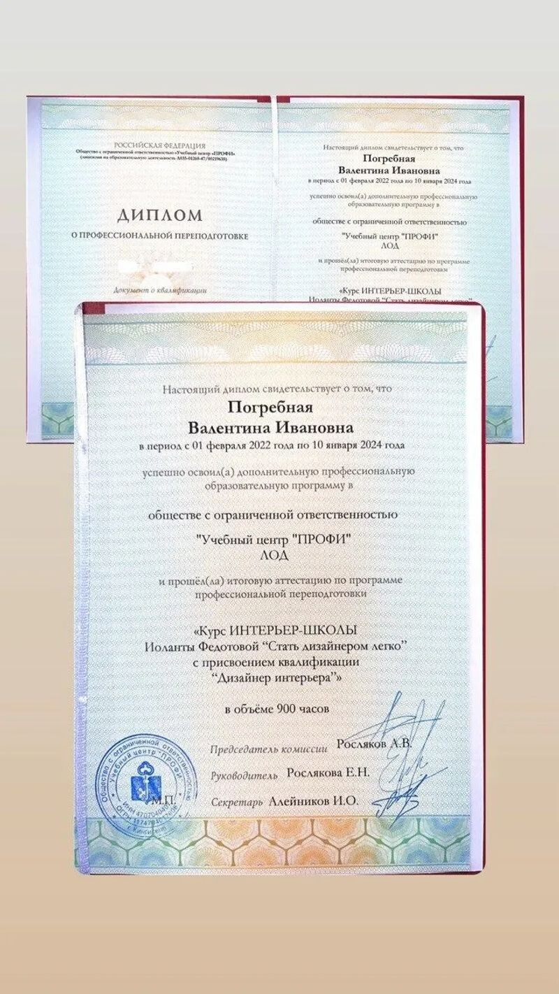 - Учебный центр «Профи», дизайнер интерьера, 2022–2024 гг.