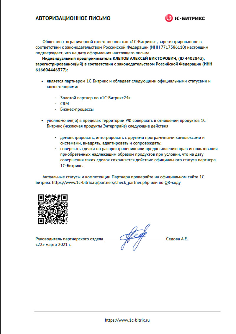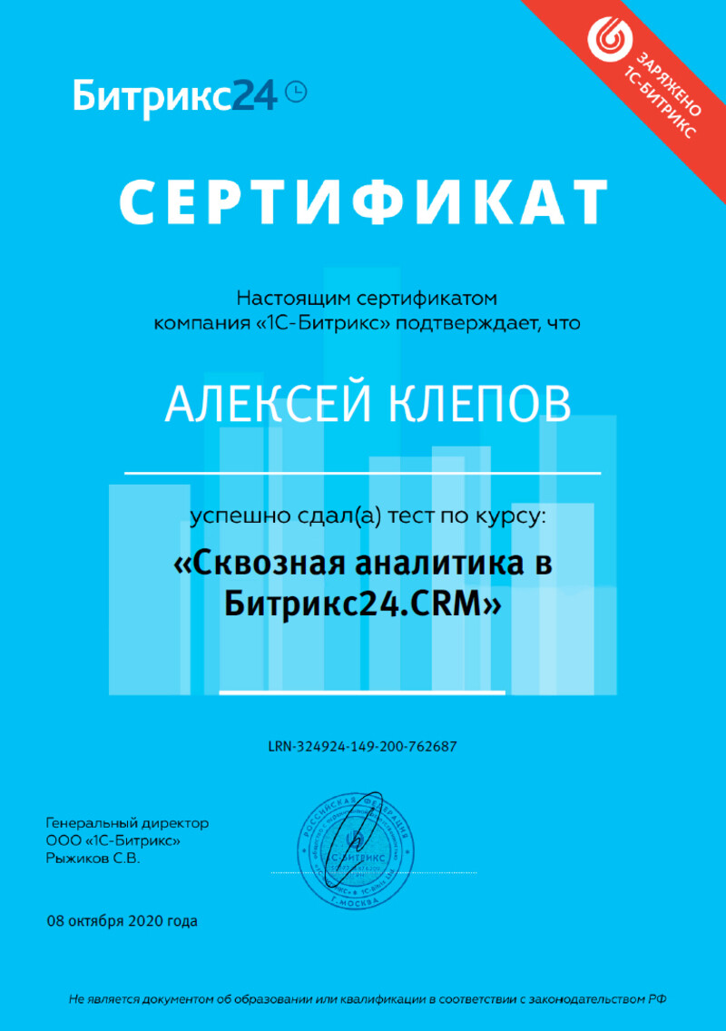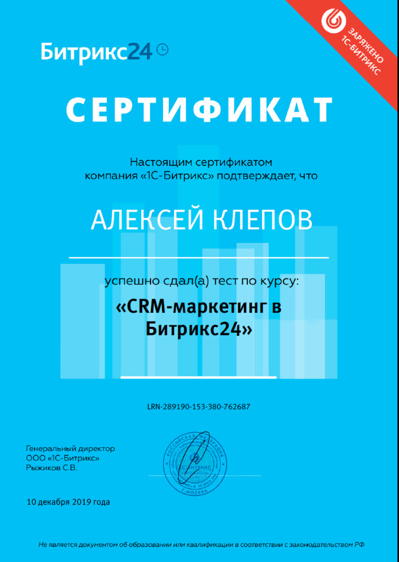 Огромная благодарность Алексею за внедрение системы Битрикс24. Он помог оптимизировать продажи и настроить сквозную аналитику, что улучшило нашу маркетинговую стратегию. Также Алексей дал нам ценные советы по использованию системы, которые существенно упростили работу менеджеров.