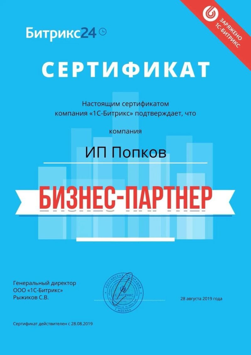 - Сертифицированный партнер сервиса «Мой склад», партнерский договор, 2019 г.