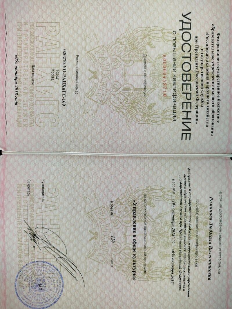 - Российская академия народного хозяйства и государственной службы при Президенте Российской Федерации, управление в сфере культуры, 2018 г.