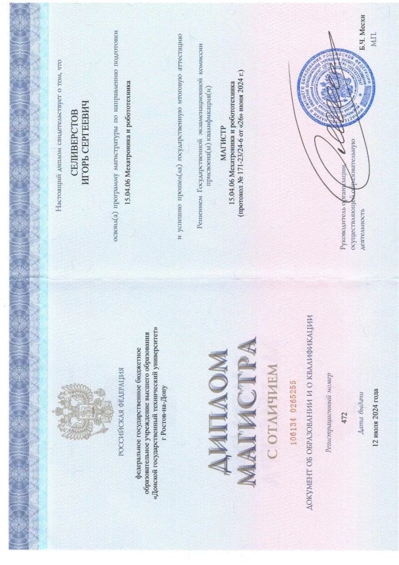 - Донской Государственный Технический Университет, кафедра "Робототехника и мехатроника", специальность "15.04.06 Мехатроника и робототехника", 2022–2024 гг.