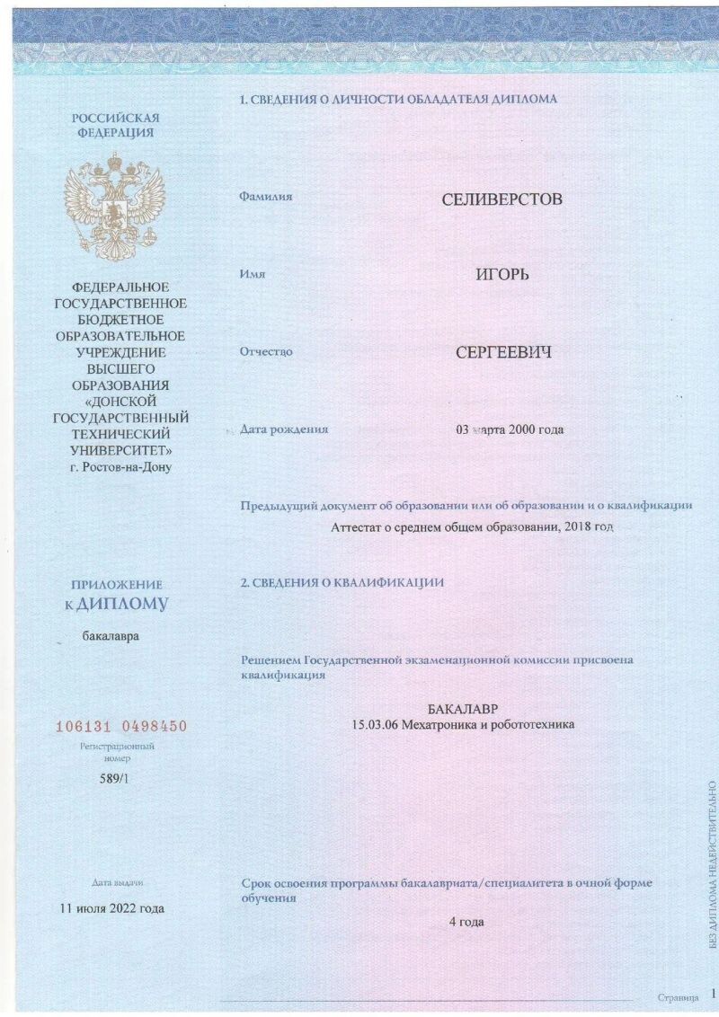 - Донской Государственный Технический Университет, факультет "Автоматизация, мехатроника и Управление", специализация "15.03.06 Мехатроника и робототехника", 2018–2022 гг.