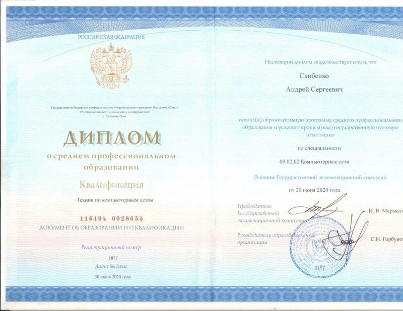 - ГБПОУ РО Ростовский колледж связи и информатики, специальность «техник по компьютерным сетям», 2016–2020 гг.