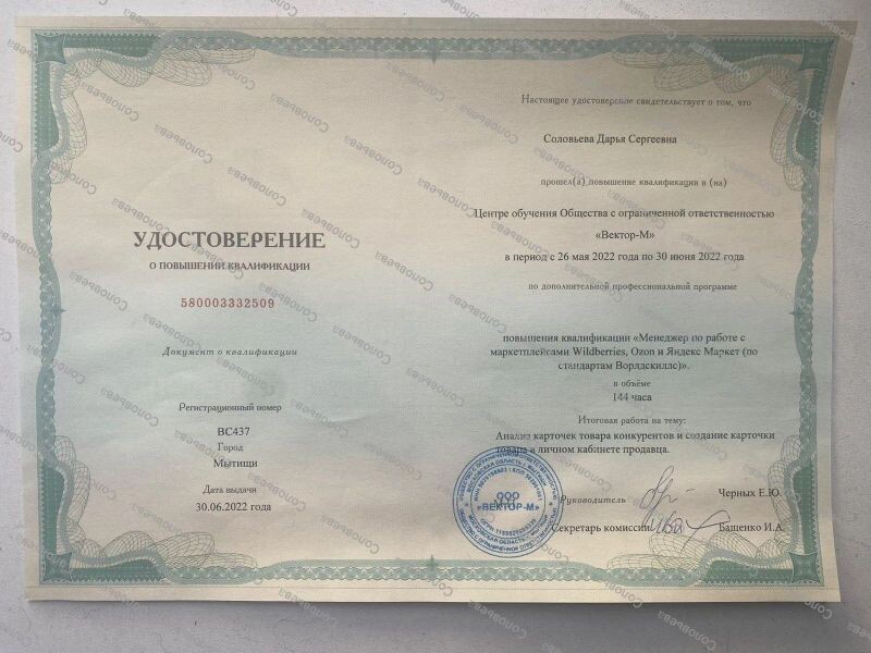 - ООО «Вектор-М», программа «Менеджер по работе с маркетплейсами Wildberries, Ozon и "Яндекс Маркет" (по стандартам "Ворлдскиллс")», 2022 г.