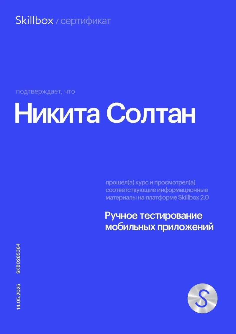 - Skillbox: ручное тестирование web и mobile приложений (с 2025 г.).