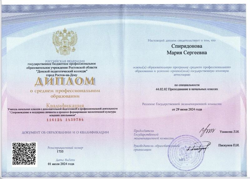 - Государственное бюджетное профессиональное образовательное учреждение Ростовской области «Донской педагогический колледж», учитель начальных классов, 2018–2024 гг.