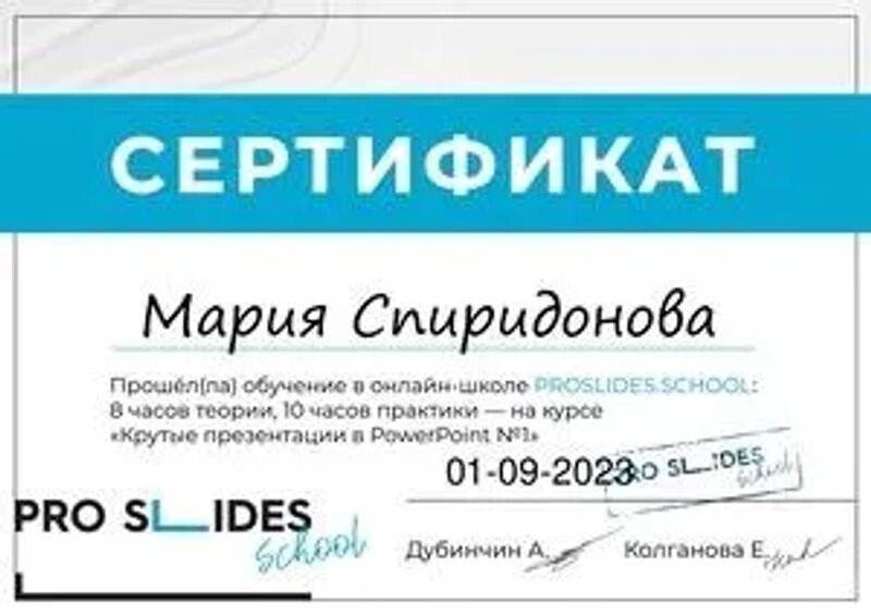 - Онлайн-школа Proslides School, курс «Крутые презентации в PowerPoint № 1», 2023 г.