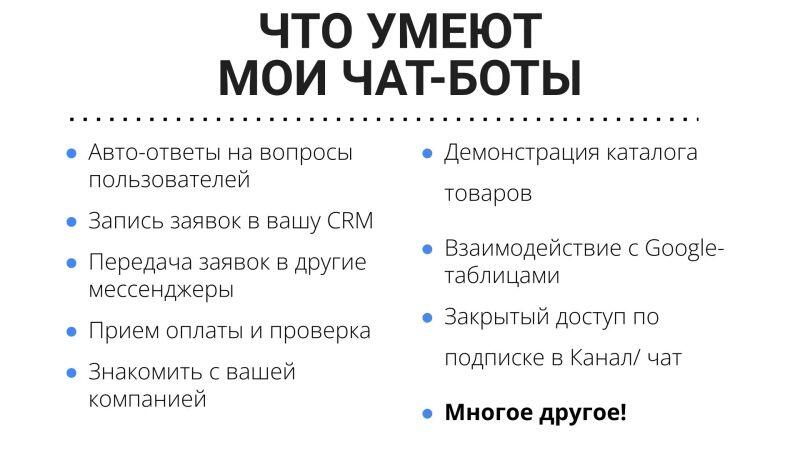 - Разработка ботов Telegram 3000 - 50000 ₽ за усл.Зависит от требуемых функций