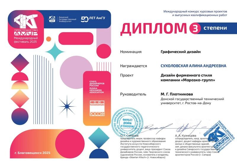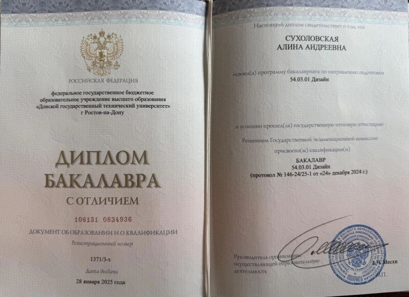 - Донской государственный технический университет, факультет «технология машиностроения», дизайн, 2020–2024 гг.