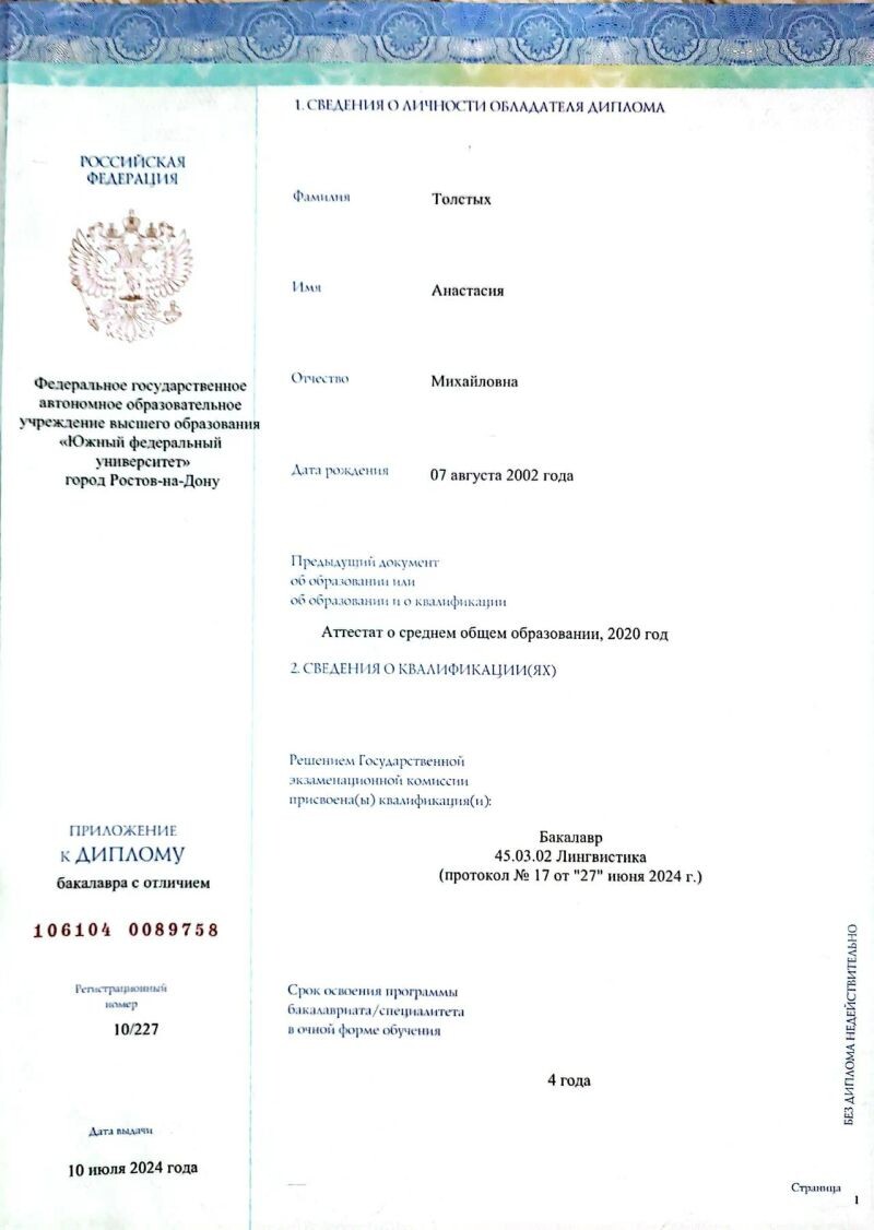 - ЮФУ, лингвистика, бакалавр, 2020–2024 гг.