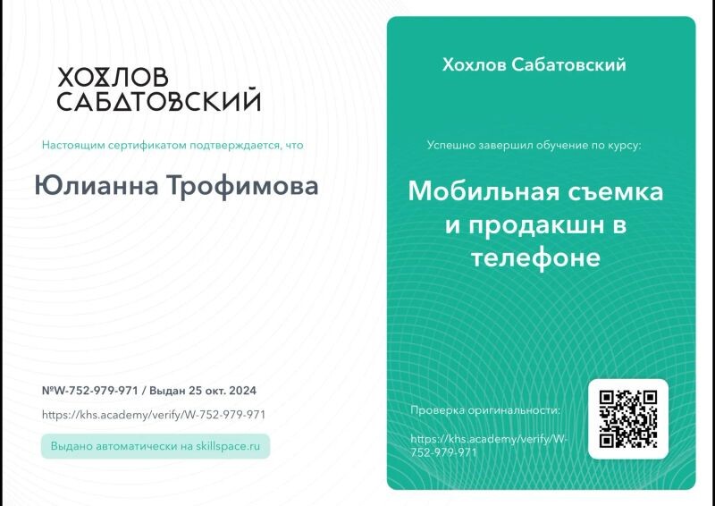 - Сертификат об окончании обучения на курсе «Мобильная съемка и продакшн на телефоне» в школе «Хохлов Сабатовский», 2024 г.