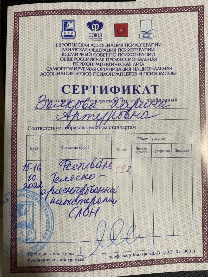 - Общероссийская профессиональная психотерапевтическая лиги, курс «Фестиваль телесно-ориентироанной психотерапии», 2022 г.