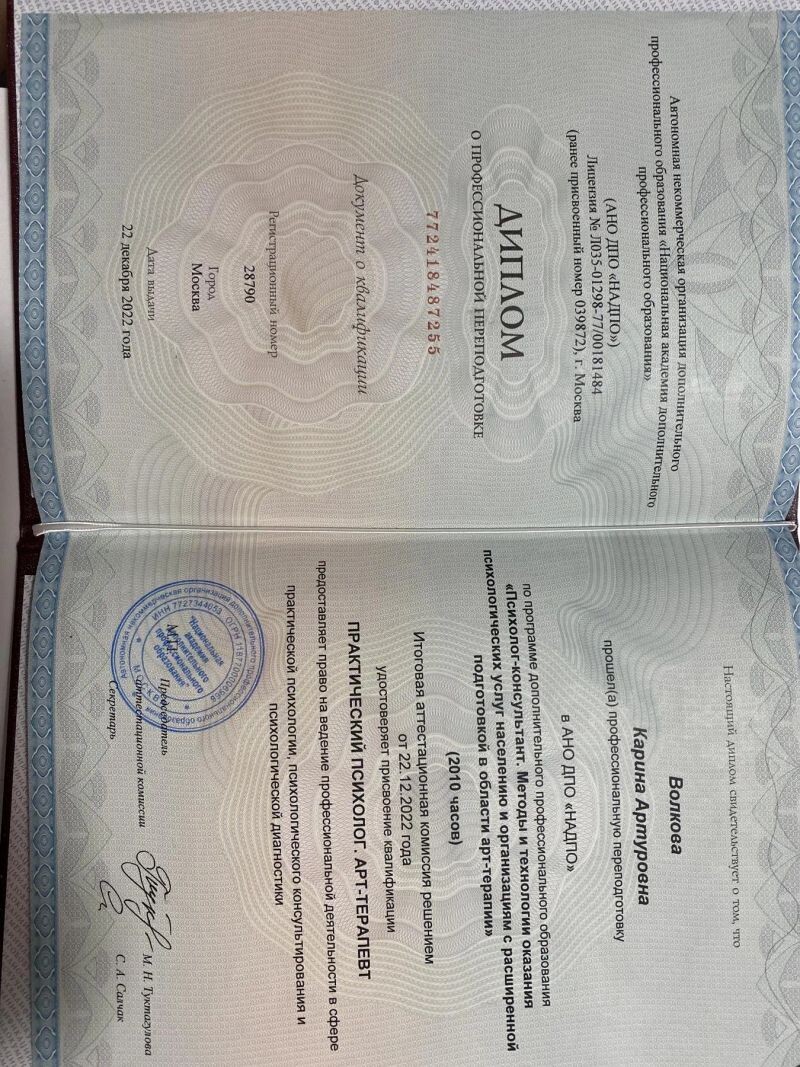 - АНО ДПО «НАДПО», программа «Психолог-консультант. Методы и технологии оказания психологических услуг населению и организациям с расширенной подготовкой в области арт-терапии», практический психолог, арт-терапевт, 2020–2022 гг.