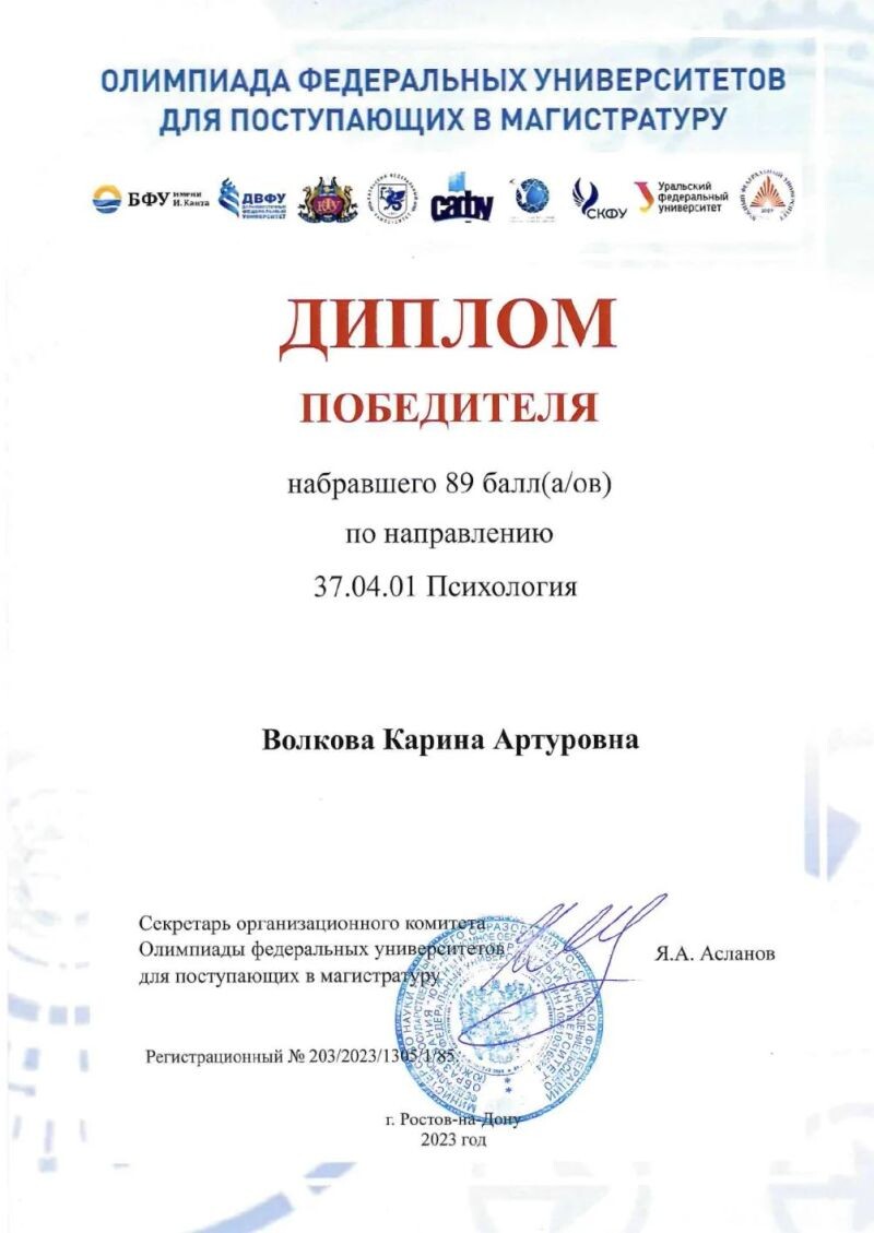 - Олимпиада федеральных университетов для поступающих в магистратуру, направление «Психология», победитель, 2023 г.