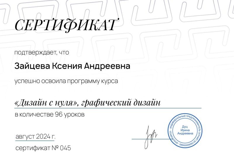 - Школа «Проектика», курс по графическому дизайну «Дизайн с нуля», 2024 г.