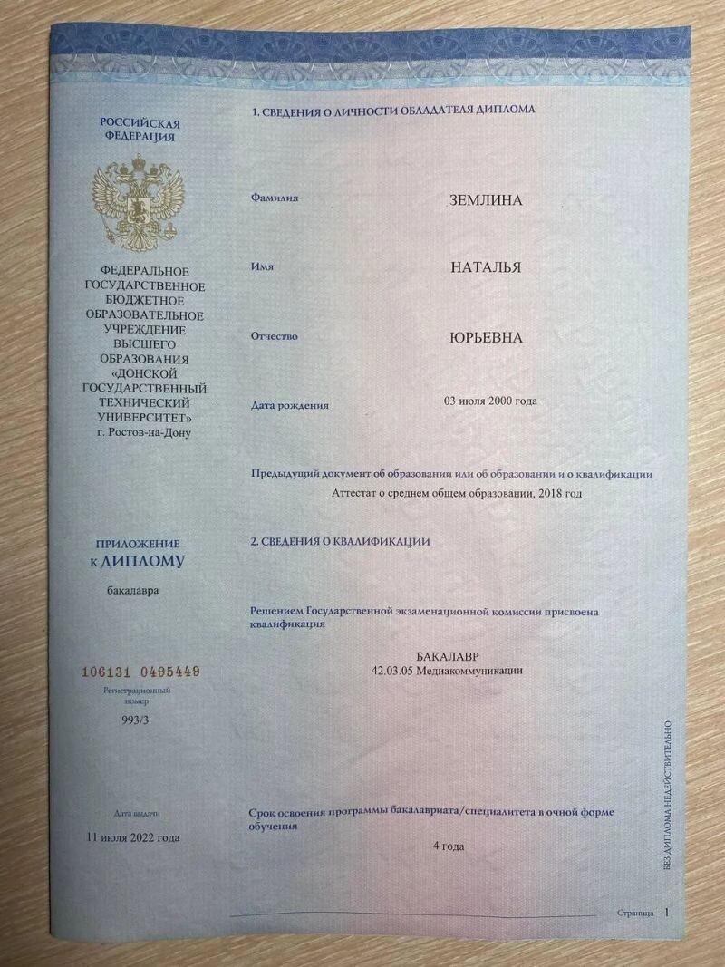- Донской государственный технический университет, программа «Медиапедагогика», 2022 г.