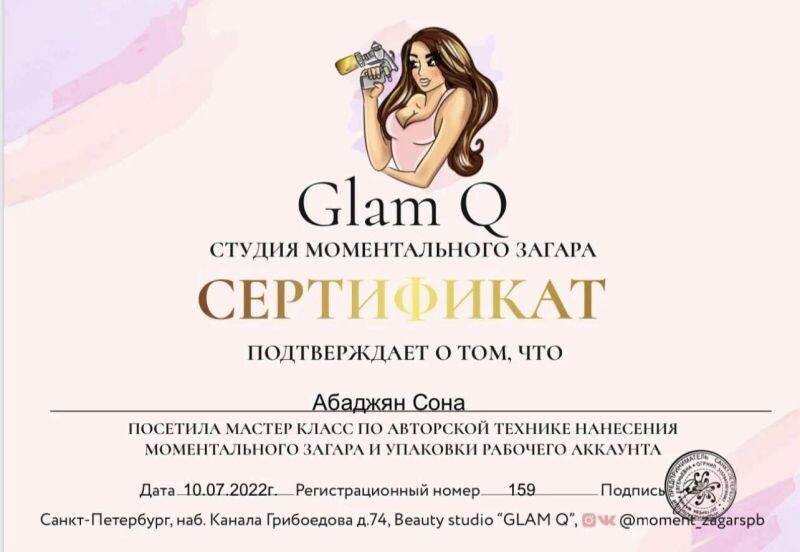 - Студия моментального загара Glam Q, мастер-класс по авторской технике нанесения моментального загара и упаковки рабочего аккаунта, 2022 г.