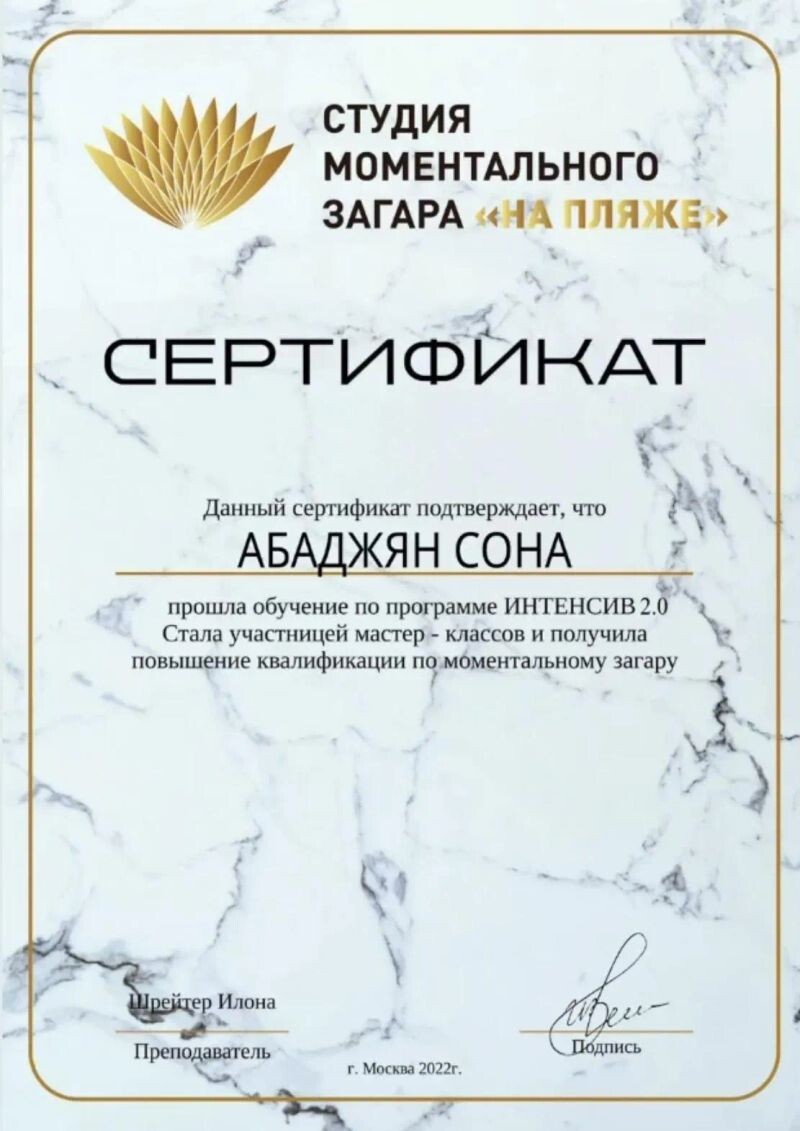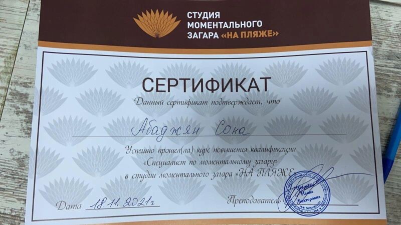 - Студия моментального загара «На пляже», курс повышения квалификации «Специалист по моментальному загару», 2021 г.