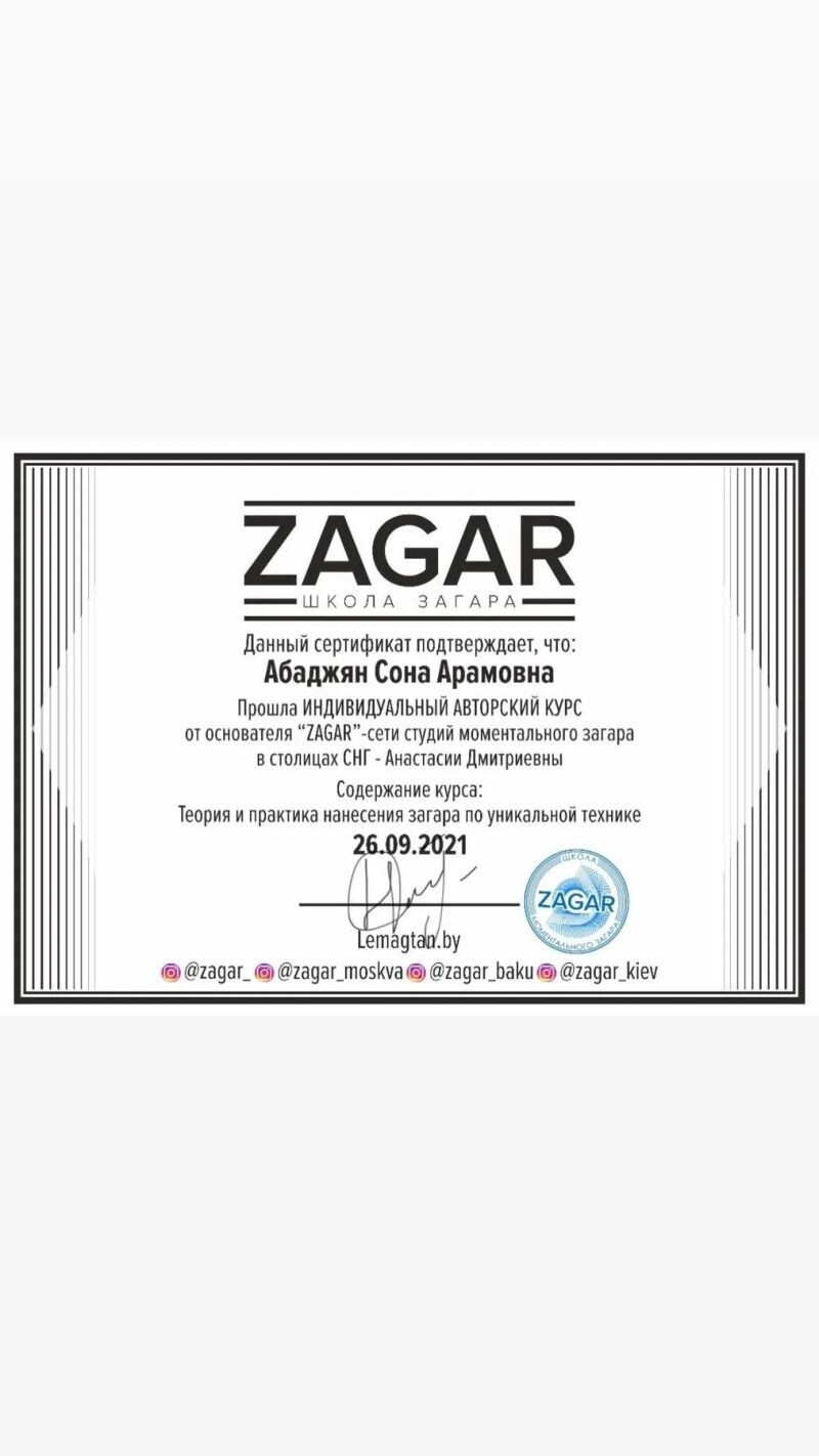 - Школа загара Zagar, индивидуальный авторский курс, теория и практика нанесения загара по уникальной технике, 2021 г.