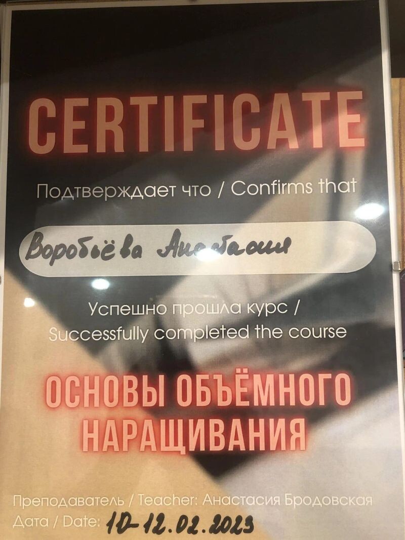 - Анастасия Бродовская, курс «Основы объемного наращивания», 2023 г.