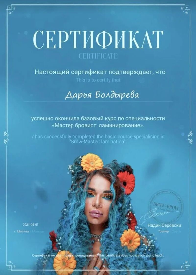 - Brow by Nadin Serovski, базовый курс по специальности «Мастер бровист: ламинирование», 2021 г.
