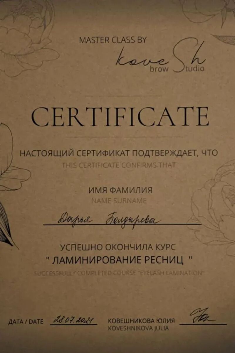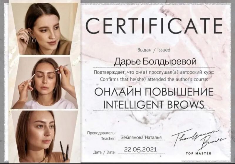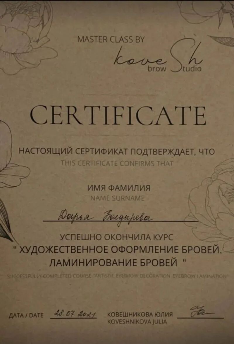 - Master class by, курс «Художественное оформление бровей. Ламинирование бровей», 2021 г.