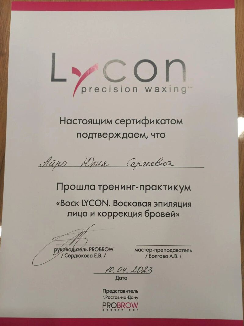 - PROBROW beauty bar, тренинг-практикум «Воск Lycon. Восковая эпиляция лица и коррекция бровей», 2023 г.
