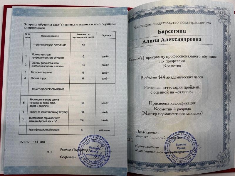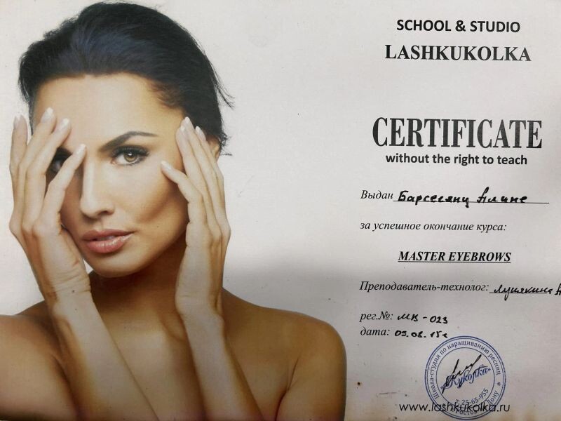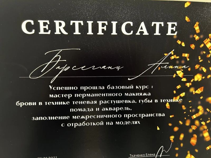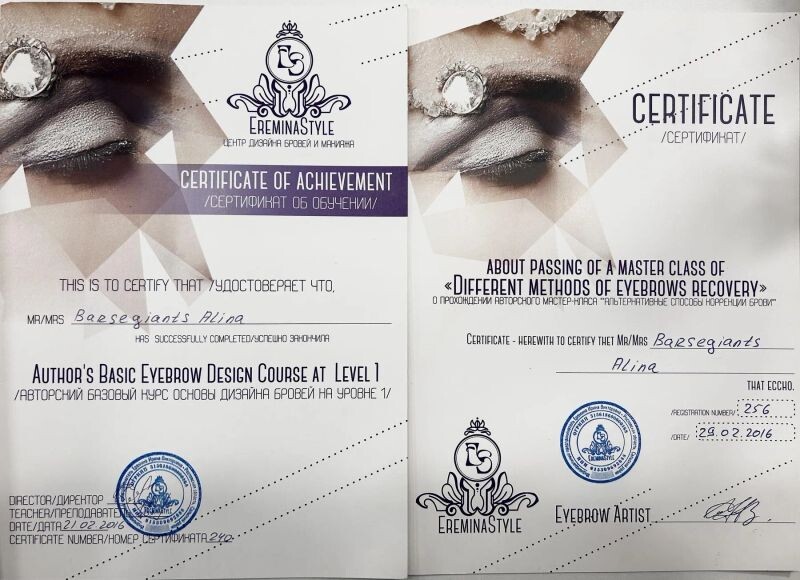 - Сертификат о прохождении базовых техник в перманентном макияже, 2016 г.