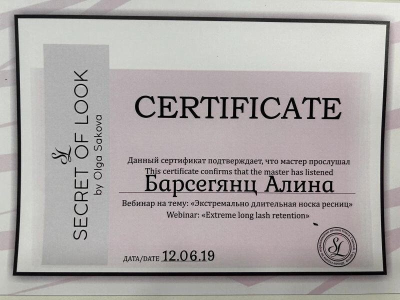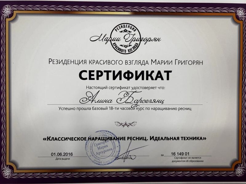 - Сертификат о прохождении курса классического наращивания ресниц, 2016 г.