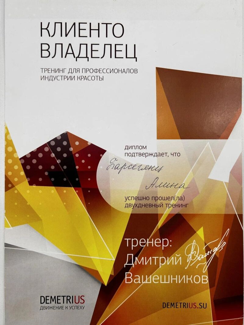 - Demetrius, сертификат о прохождении курса «Клиентовладелец», 2019 г.