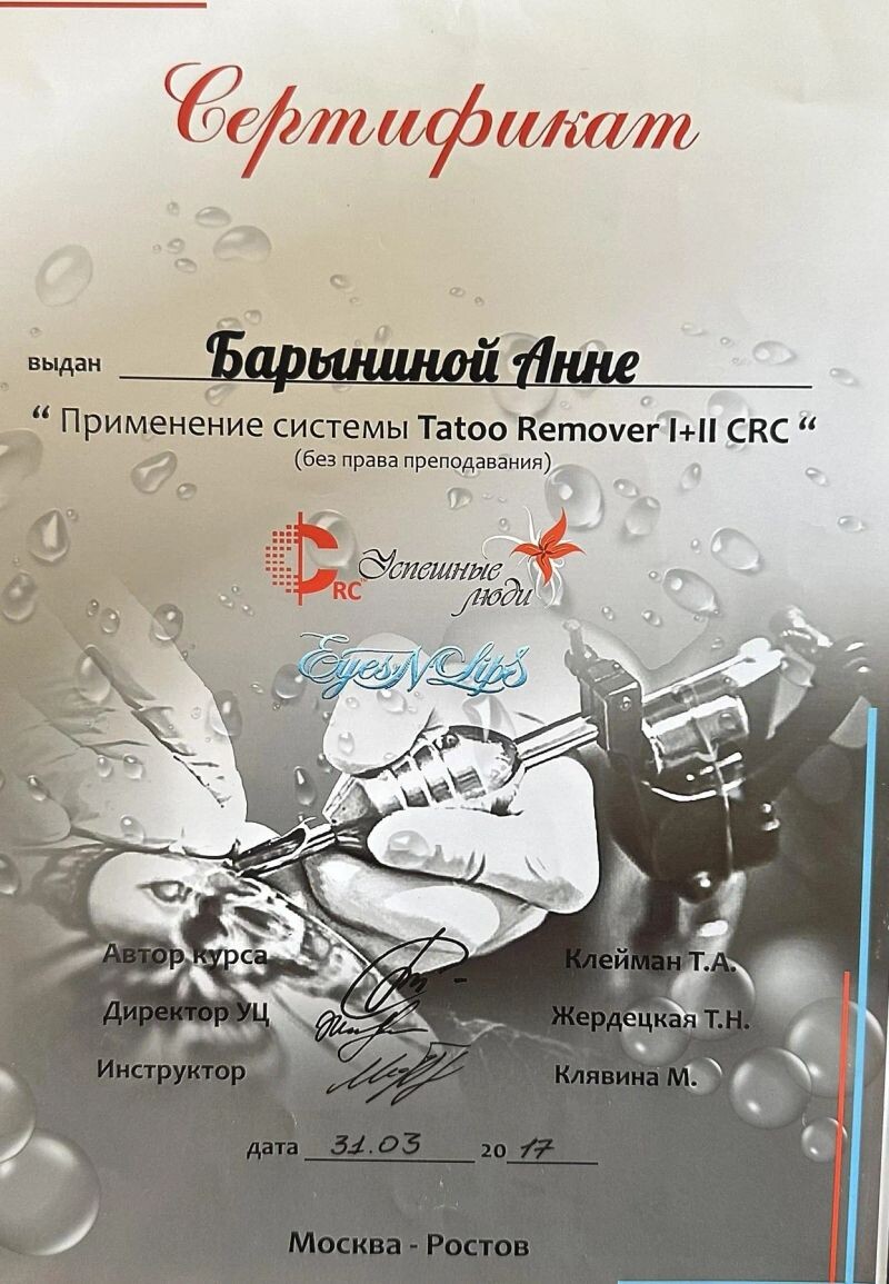 - Применение системы Tatoo Remover I+II CRC (с 2017 г.).