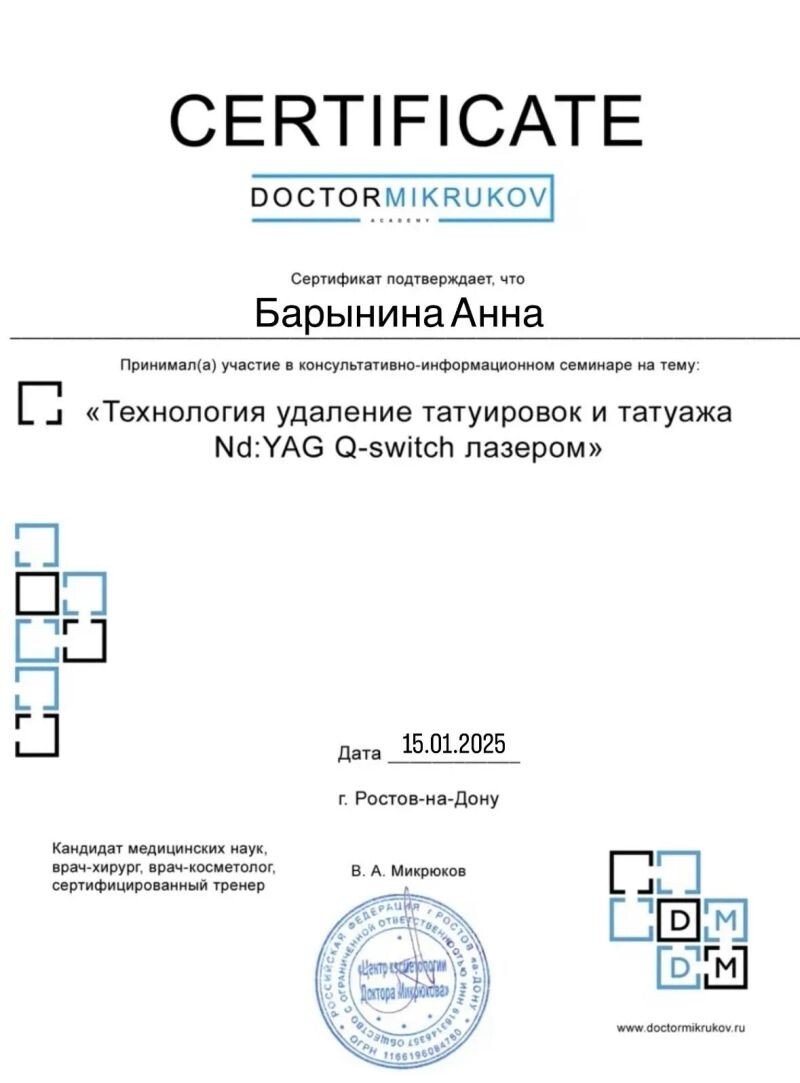 - « Технология удаление татуировок и татуажа Nd: YAG Q-switch лазером», 2025 г.