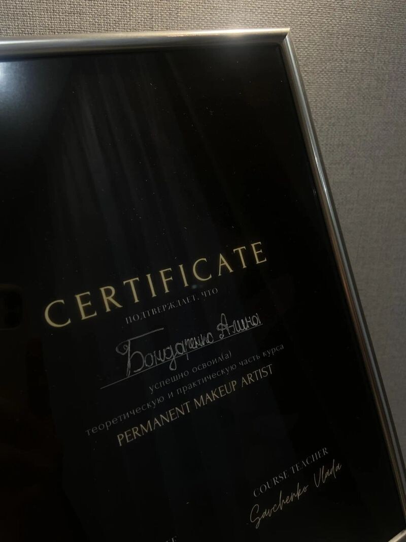 - Освоила теоретическую и практическую часть курса PERMANENT MAKEUP ARTIST (с 2023 г.).