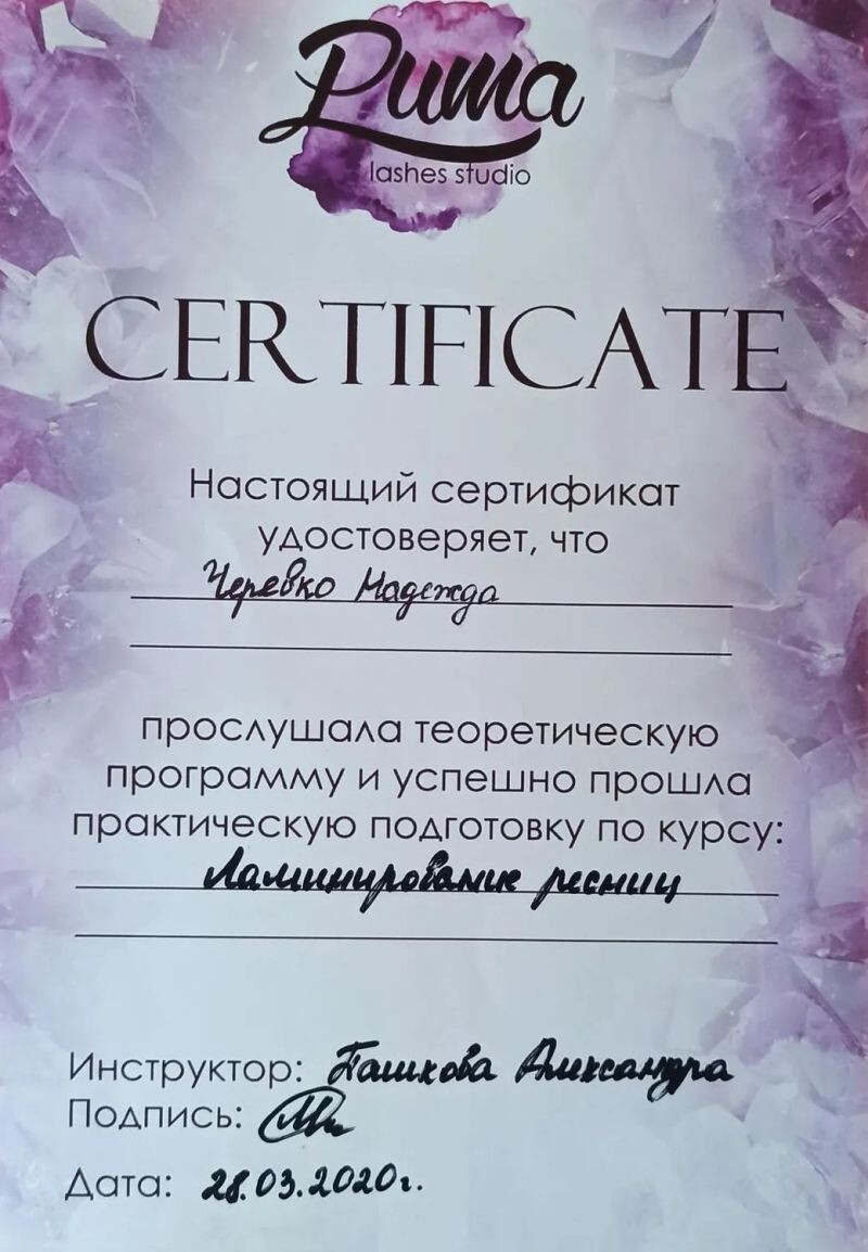 - Puma lashes studio, курс «Ламинирование ресниц», 2020 г.
