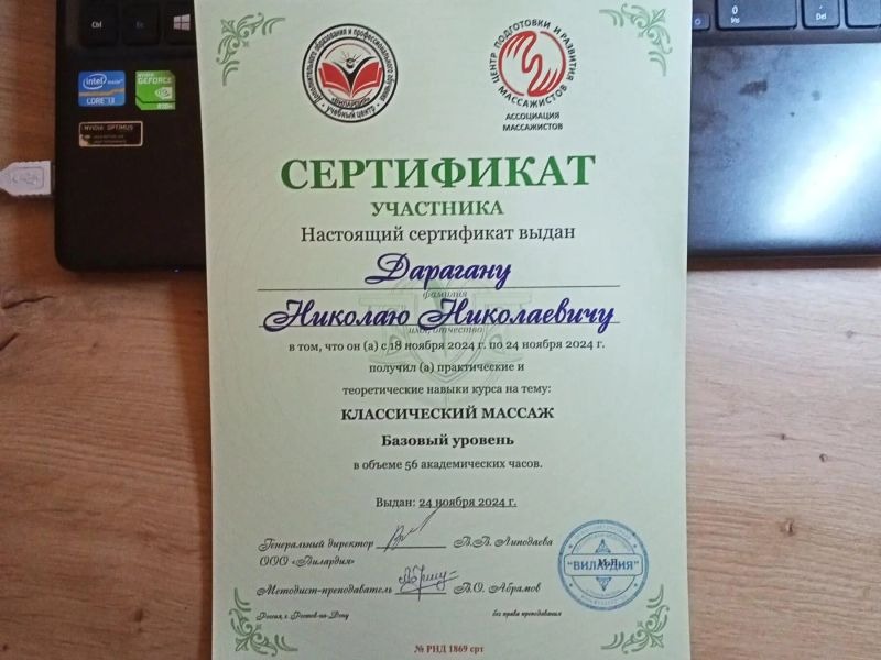 - Сертификат по классическому Массажу ЦПРМ Вилардии в 2013 и 2024 году.