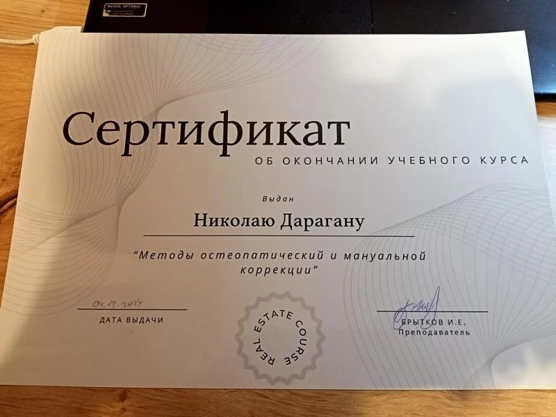 - Сертификат Методы остеопатической и мануальной коррекции (с 2024 г.).