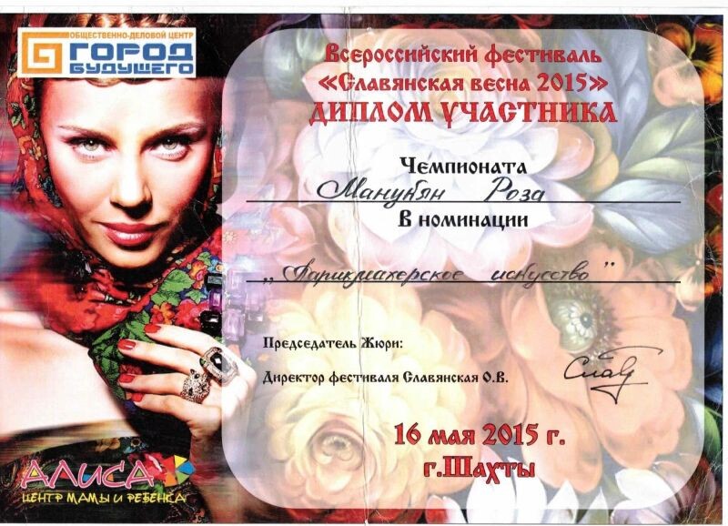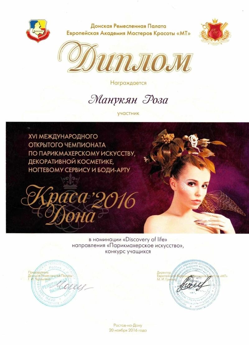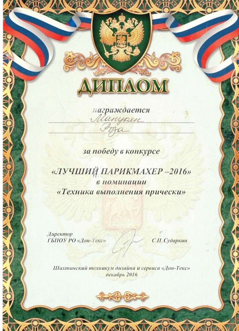 - Победитель конкурса «Лучший парикмахер-2016».