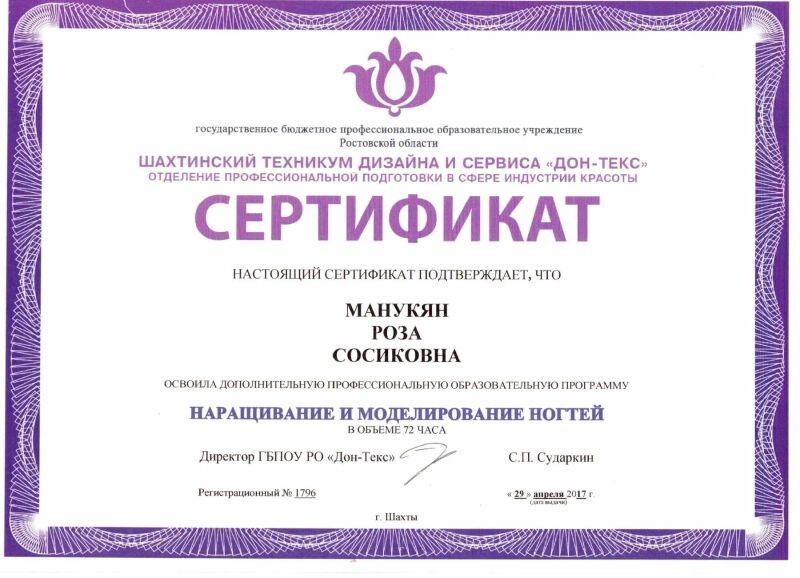 - Шахтинский техникум дизайна и сервиса «ДОН-ТЕКС», программа «Наращивание и моделирование ногтей», 2017 г.