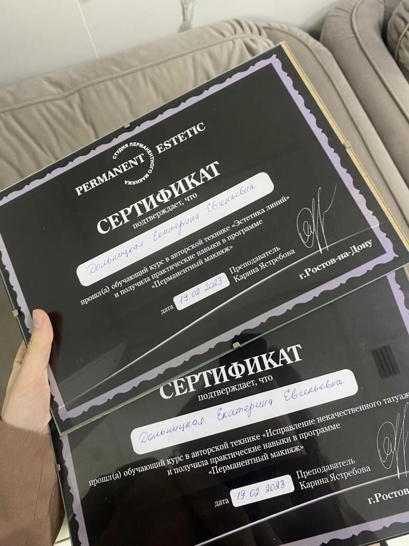 - Студия перманентного макияжа Permanent Estetic, курс в авторской технике «Эстетика линий», 2023 г.