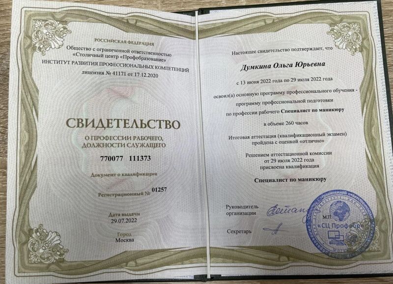 - Институт развития профессиональных компетенций, специалист по маникюру, 2022 г.