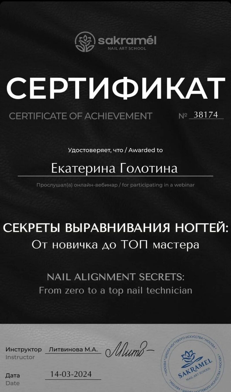 - Sakramel, вебинар «Секреты выравнивания ногтей: от новичка до топ-мастера», 2024 г.